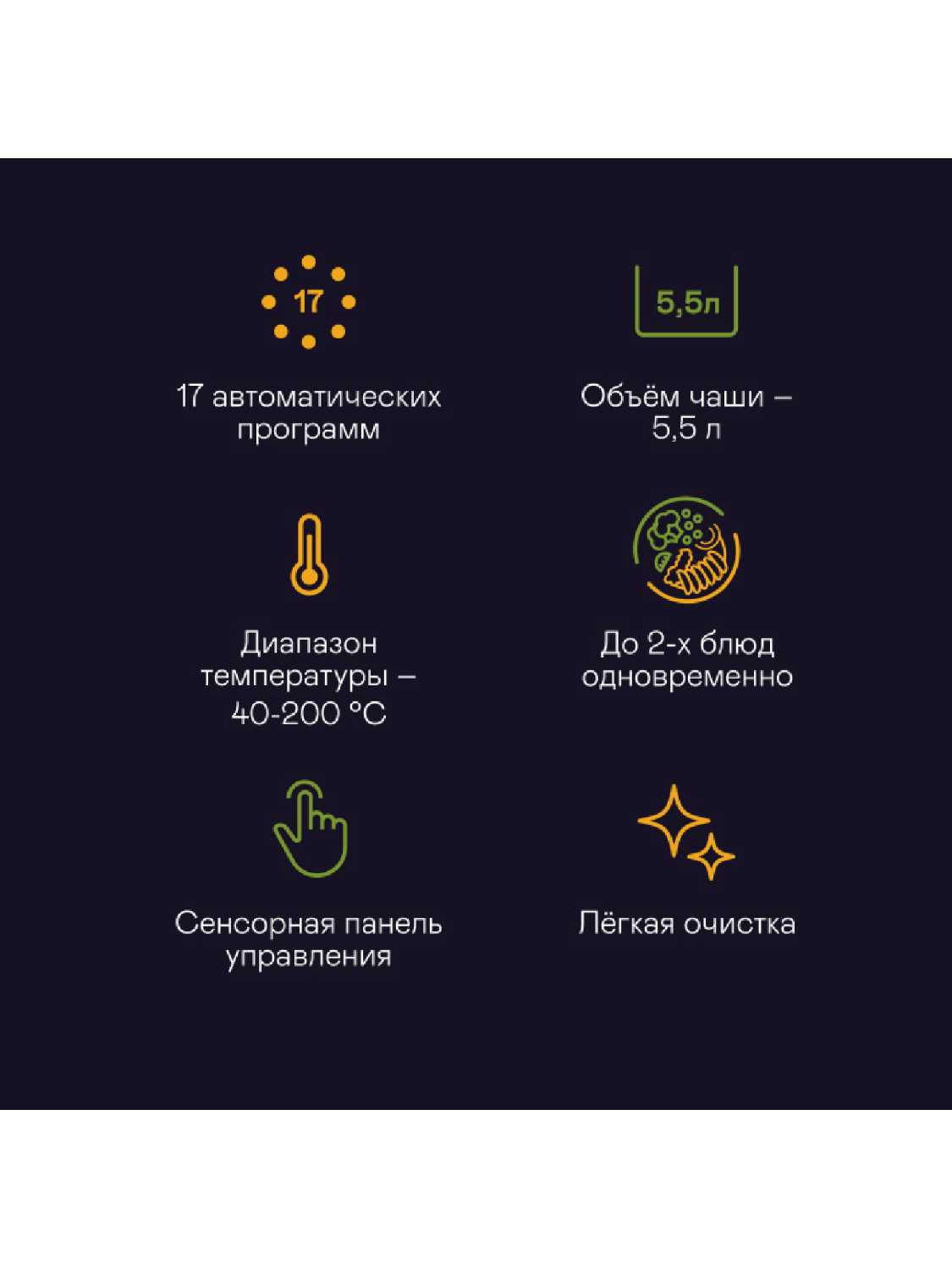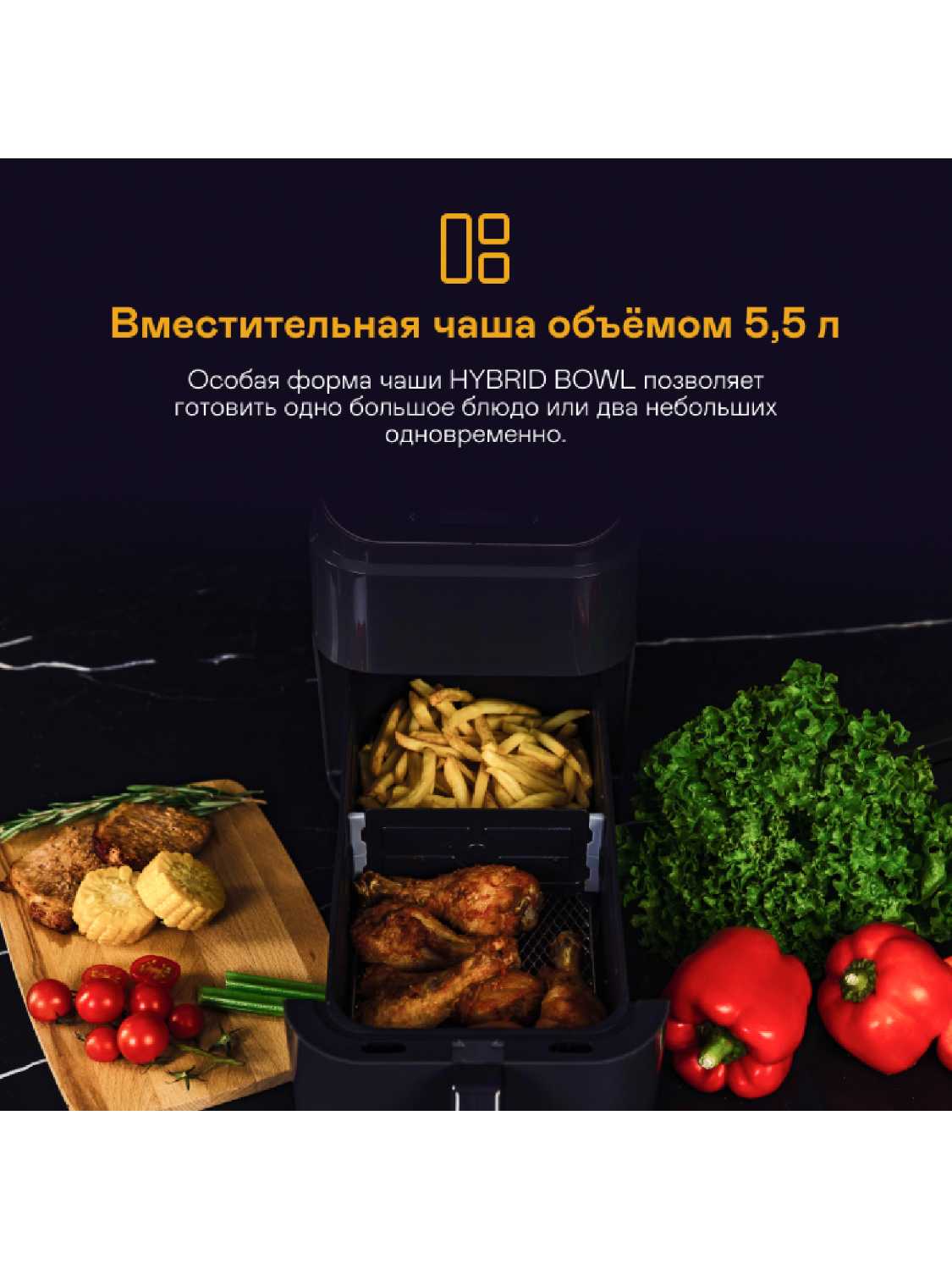 Чаша для приготовления объемом 5,5 литра, предусмотрено разделение на две зоны и возможно готовить сразу два блюда.