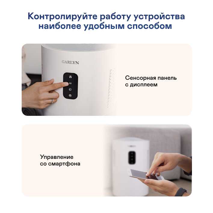 Управлять проще всего со смартфона. Ставите приложение, регистрируетесь и все. Настроек куча. Можно выбирать как будет работать вентилятор, установить таймер, можно установить влажность от 40 до 80%. Если не хотите ничего в ручную настраивать, ставьте режим "Авто", там максимальная очистка и влажность будет 50%. Также можно выключить все звуки кнопок.