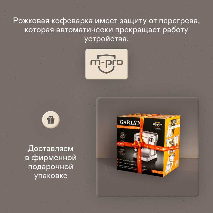 - + Давно хотелось приобрести кофеварку, чтобы иметь возможность пить вкусный кофе дома. Приобрела кофеварку Garlin C60 и поняла, что слелала правильный выбор. Вообще, это не пераыы помощник в моем доме продукции марки Garlin, нравится дизайн их продукции и отличные потребительские качества бытовой техники. С кофеваркой помогли разобраться видеоролики, особенно от меннджера компании Алии . При запуске в экслуатацию кофеаарку не забудьте снять красную крышечку , которая находится под емкостью с водой. Вкуснейший кофе готовится осень быстро, при этом получается ароматный и с пенкой Crema. Приобрела разный кофе, теперь буду экспериментировать со вкусами. Спасибо производителю и продавцу