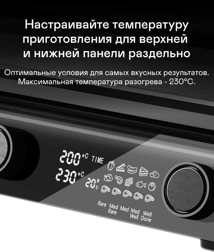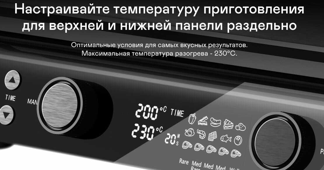 - Интеграция с электроникой гриля позволяет автоматически корректировать время готовки.
