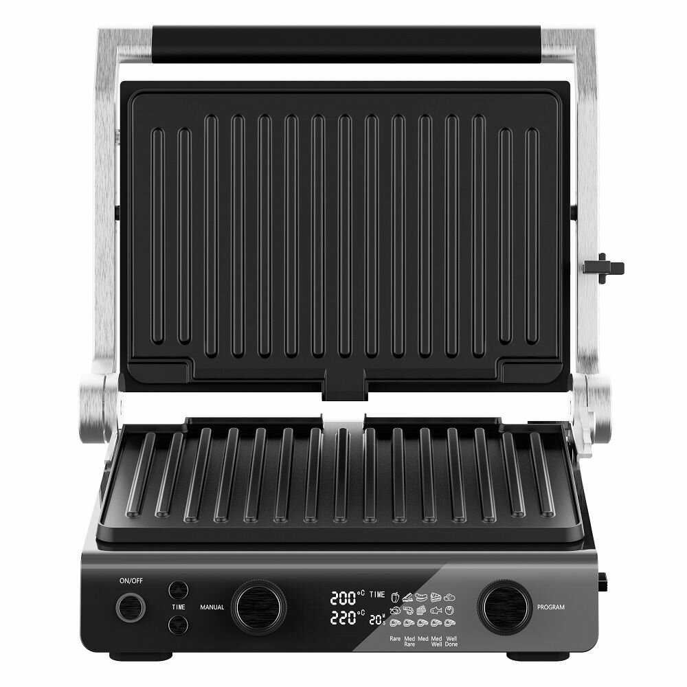 Электрогриль комплектуется тремя типами съемных панелей: рифленой для гриля, гладкой для блинов и яичницы, а также вафельницей в клеточку. Это позволяет готовить стейки, овощи, горячие бутерброды, вафли и даже шаурму. Например, пользователи отмечают, что гладкая панель идеальна для панкейков, а вафельница создает хрустящие десерты, которые особенно нравятся детям. -