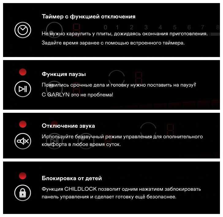 Сначала хочется отметить удобство использования. Варочная панель имеет интуитивно понятное управление, что позволяет быстро разобраться во всех функциях и настроить нужные параметры для приготовления пищи. Индикация выбранных опций и уровней мощности. Особо порадовал таймер. Можно установить определенное время готовки и не беспокоиться о том, что блюдо может пережариться или покипеть. После завершения работы таймера панель автоматически отключается, что очень удобно и безопасно.