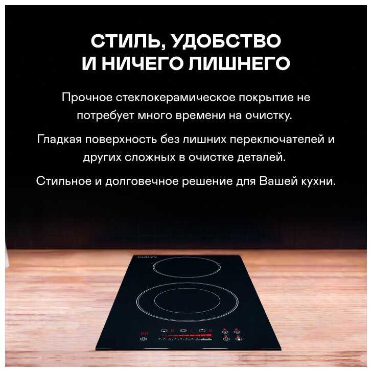 Ещё одним преимуществом этой варочной панели является её легкость в уходе. Стеклокерамическое покрытие очень просто чистить, и на поверхности не остаются пятна и следы.