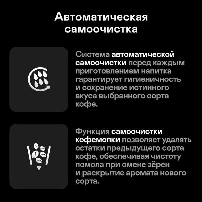 Чистить и мыть легко, кому это точно также важно как и мне - не переживайте вообще. Минимально по телодвижениям получается, быстро вынимаются контейнеры, чистятся, ставятся обратно. Тем более, лайк производителю за функцию самоочистки, это прямо оценили. Кофе разный, пробовал эспрессо, американо, двойной эспрессо, капучино, латте. Понравились все. Про помол зерен могу сказать тоже только в хорошем ключе, нравится, как молет, главное, подобрать свой режим, под свой вкус, я совсем мелкий помол люблю. Кружка для кофе у меня большая, это в настройках теперь по умолчанию стоит, а так, можно объем напитка регулировать под настроение и тд)) Капучинатор вместительный, если много пенки надо, то вообще без проблем, взбивает так, что она потом не оседает.