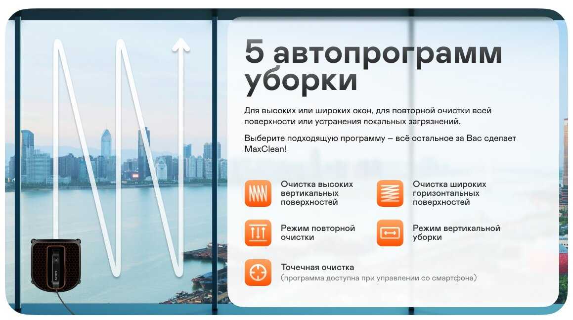 - Автоматические программы («Зигзаг», «Вертикаль», «Горизонталь») адаптированы под разные типы загрязнений.