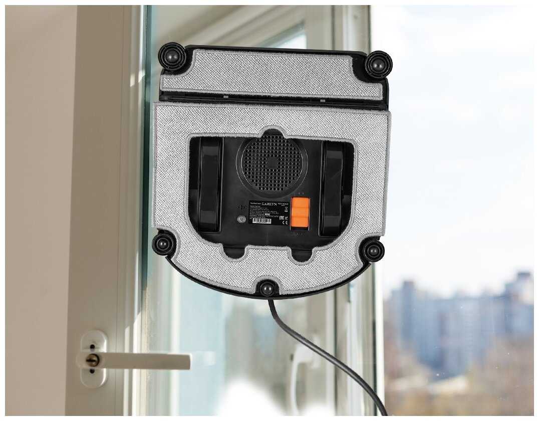 - При низком заряде робот подает звуковой сигнал и автоматически блокируется на стекле.