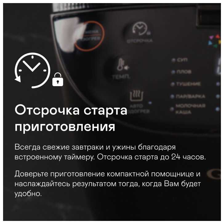 Таймер позволяет отложить старт приготовления до 24 часов. Пользователи успешно используют эту функцию для завтраков: загружают ингредиенты с вечера, а утром получают готовую кашу. Временные промежутки соблюдаются точно, перегрева не наблюдается. -