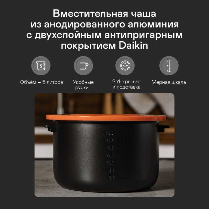 - Вместительная чаша 5 л с ручками подходит для семейного приготовления: