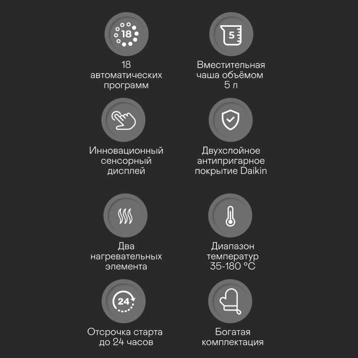 - 18 автоматических программ охватывают разнообразные сценарии готовки: