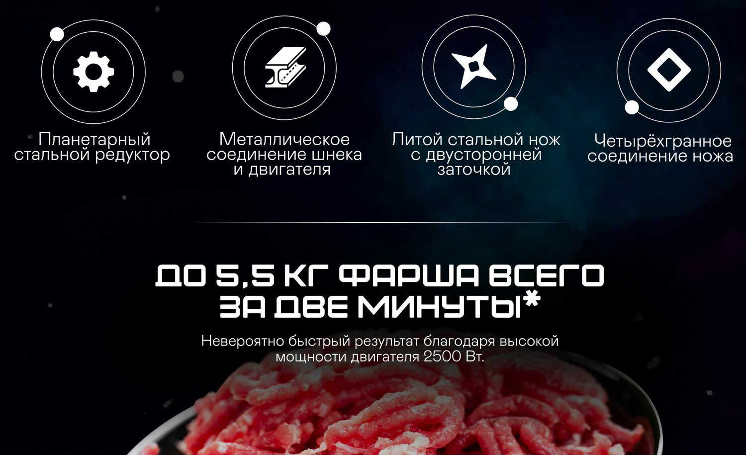 Устройство демонстрирует высокую производительность: 1 кг мякоти перемалывается за 1.5–3 минуты, а 5 кг говядины — за пару минут. Мощный двигатель обеспечивает стабильную работу без остановок даже при больших объемах, например, для заготовки пельменей. Реверс и сенсорное управление дополнительно оптимизируют процесс. -