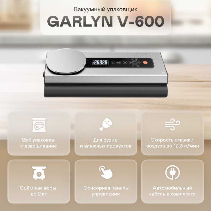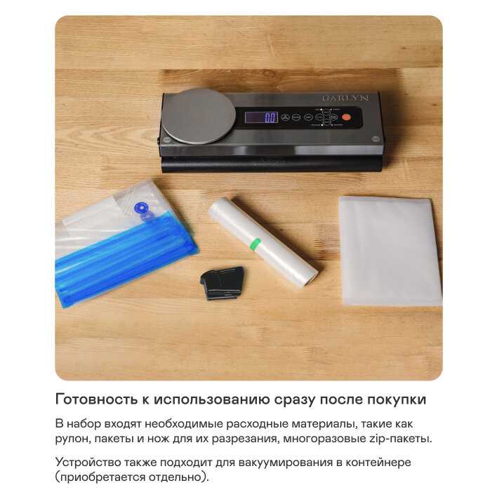 Подробная комплектация : | 1. Упаковщик вакуумный - 1шт 2. Шланг для вакуумирования - 1шт 3. Пакеты для вакуумных упаковщиков GARLYN, 20 × 30 см - 5шт 4. Зип-пакеты для вакуумирования, 21 × 22 см - 15шт 5. Рулон для вакуумных упаковщиков GARLYN, 20 × 200 см - 1шт 6. Нож для разрезания пакетов - 1шт 7. Платформа весов - 1шт 8. Шнур для прикуривателя автомобиля - 1шт 9. Электрошнур - 1шт 10. Руководство пользователя - 1шт 11. Краткая инструкция пользователя - 1шт 12. Гарантийный талон - 1шт |