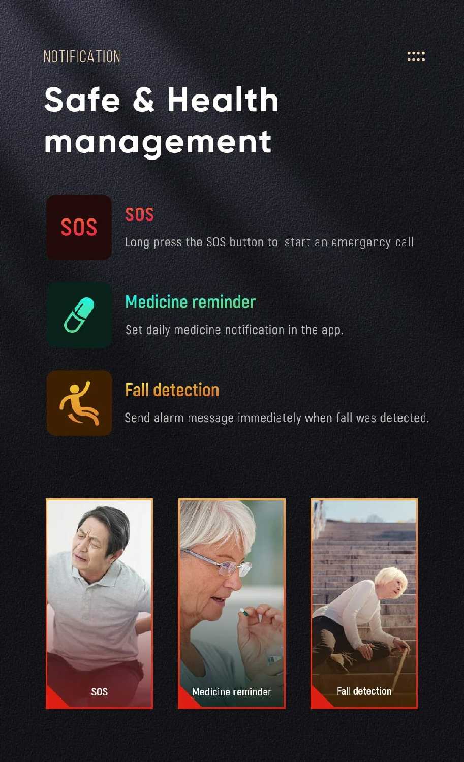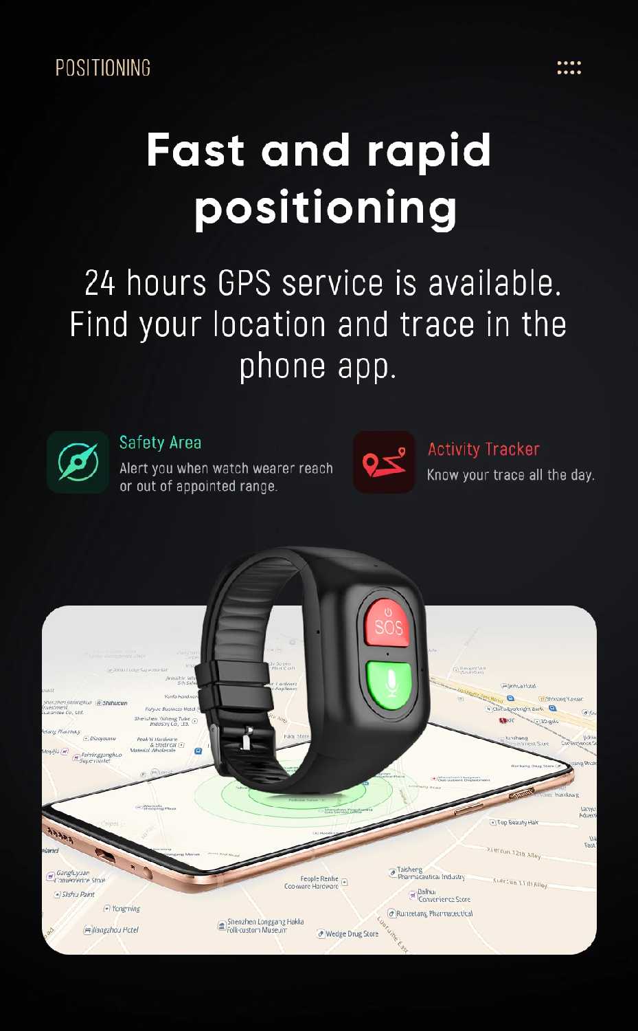 Дополнительная информация : | Виброзвонок, измерение пульса, измерение давление, измерение температуры, кнопка экстренного вызова SOS, дистанционное прослушивание, телефонные звонки (осуществляются по громкой связи в часах), телефонный справочник, оповещение о низком заряде батареи, опция электронного забора оповестит родственников, если пенсионер выйдет за установленные границы, шагомер. |