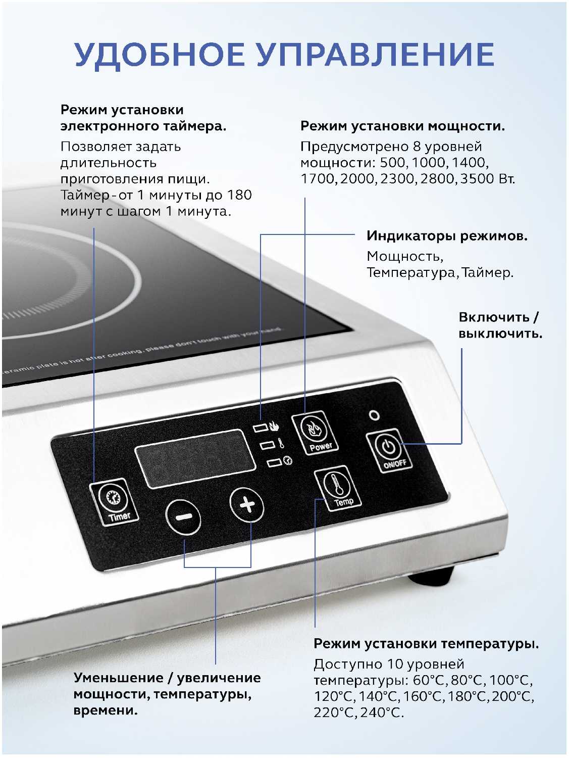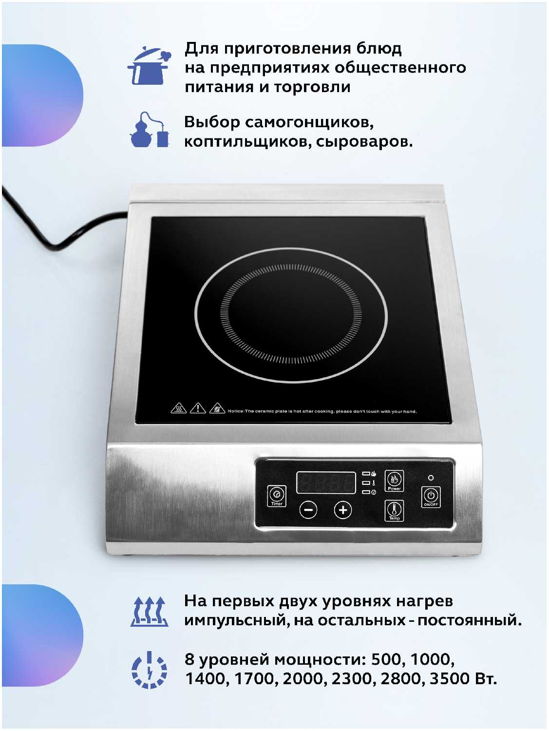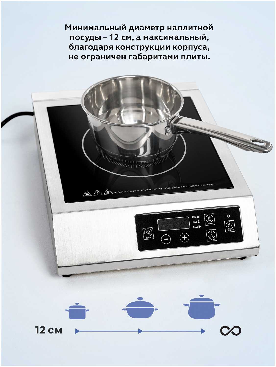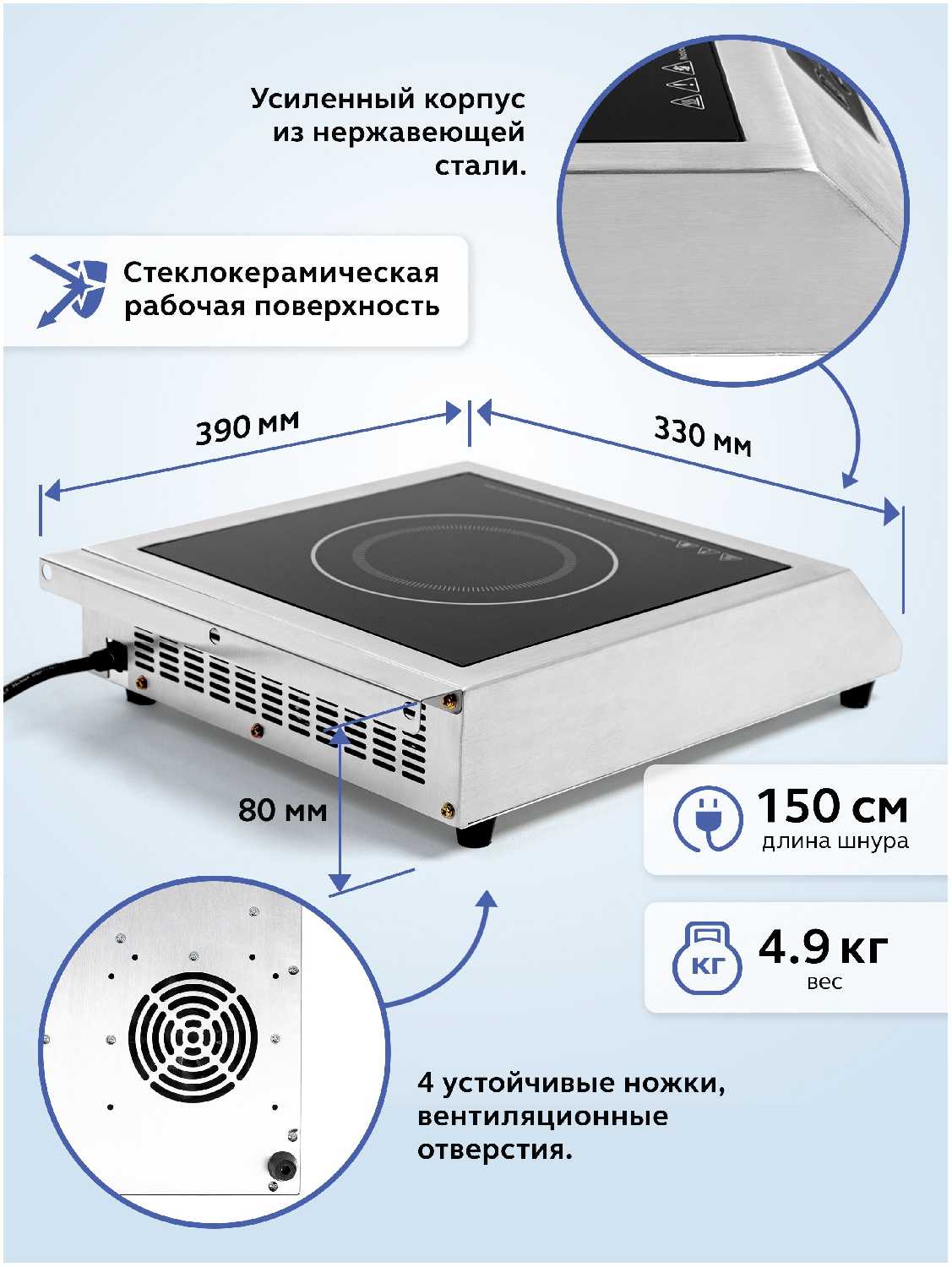 Высота самой плиты - 8см, с ножками - 10см. Тогда, как многие плиты подобного уровня выше. Нагрев ёмкости с 20-ю литрами на 2.800вт за 45минут, на 3.500вт вообще молчу.