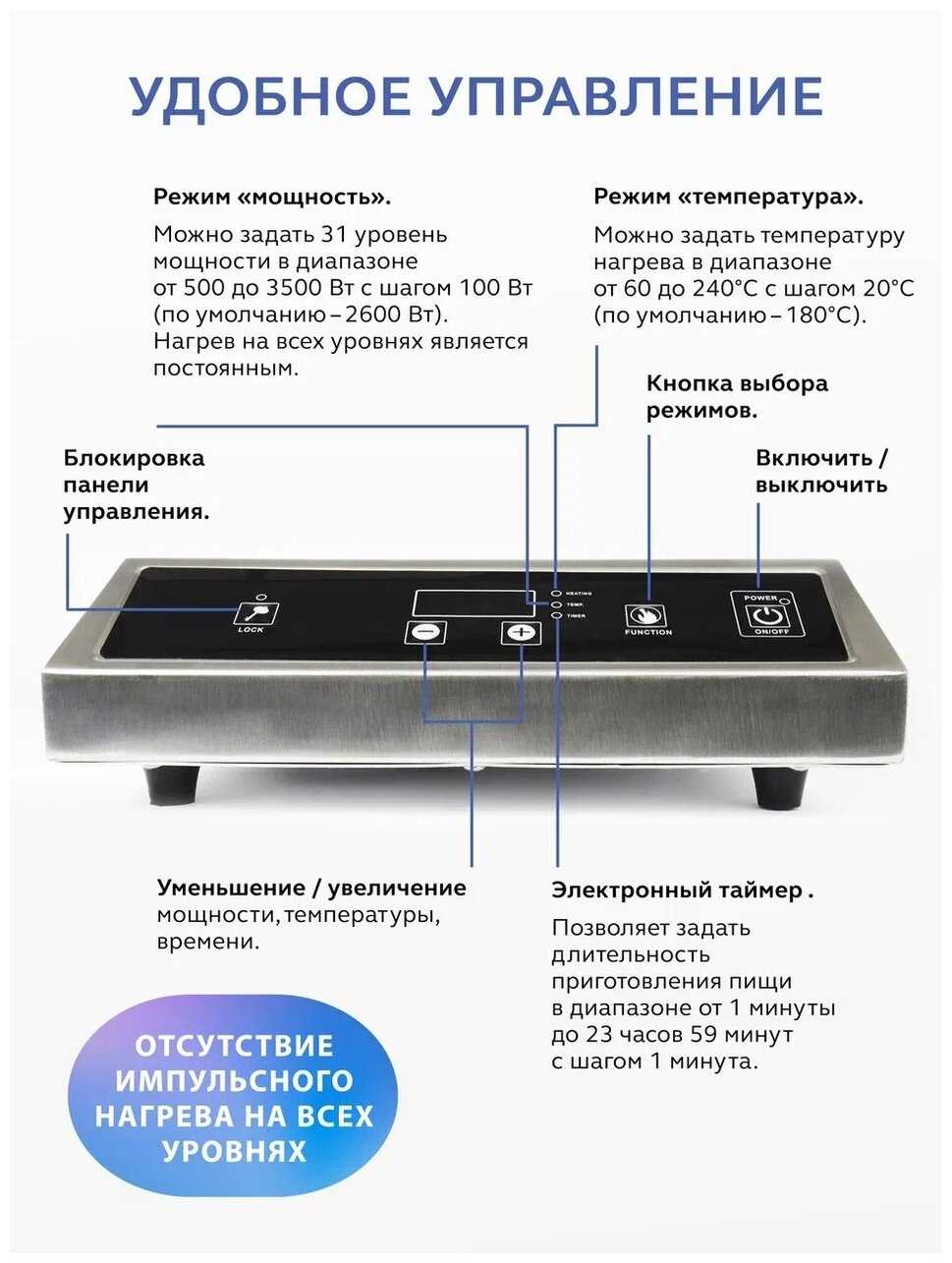 Импульсный режим при мощности менее 2 кВт, автоматическое выключение после 3 часов работы.