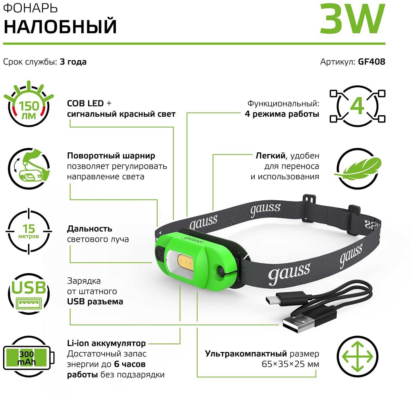 Отзывы о Налобный фонарь gauss GFL408