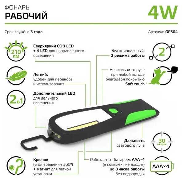 Дополнительная информация : | тип батарей: AAA, количество батарей: 4, количество режимов работы: 2 |