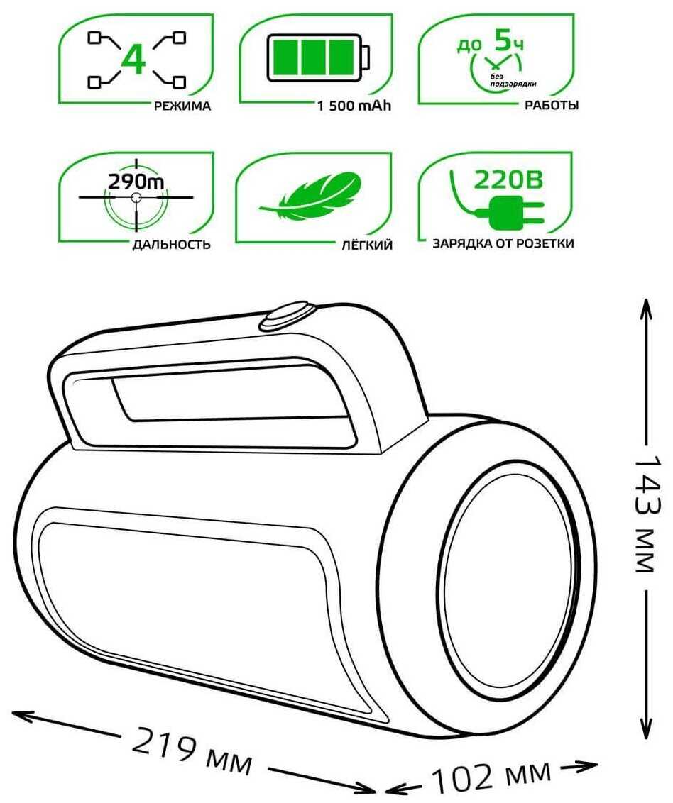 - + Яркий, 3 режима работы, димируемый свет, ёмкий аккумулятор