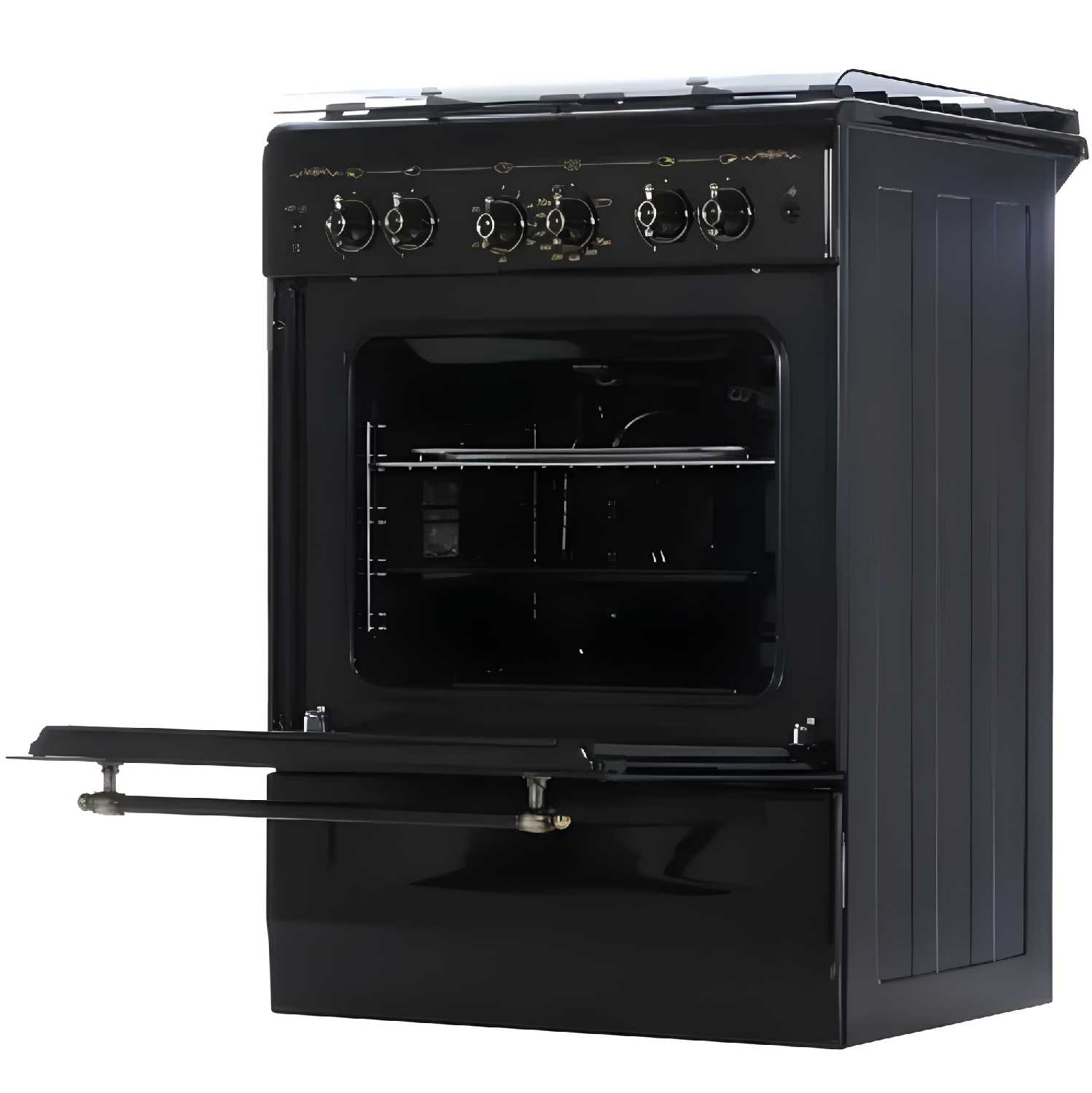 | Особенности конструкции : | вертел, подсветка духовки, чугунные решетки, эмаль легкой чистки, ящик для посуды |