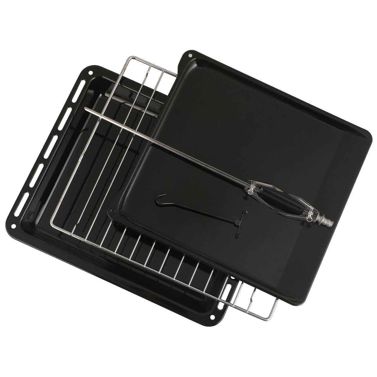 В комплект поставки входят все необходимое для разнообразного приготовления пищи: два противня, одна чугунная решетка, набор для гриля (вертел и крюк) и жаровня. Наличие вертела расширяет возможности духовки, позволяя готовить шашлык и крупные куски мяса. Комплектация оценивается пользователями как полная и готовая к использованию сразу после распаковки.