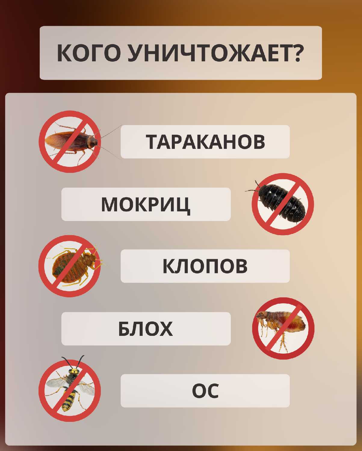 | Вид насекомых : | блохи, клещи, клопы, кожееды, комары, мошки, муравьи, мухи, пауки, ползающие насекомые, постельные клопы, тараканы, чешуйницы |