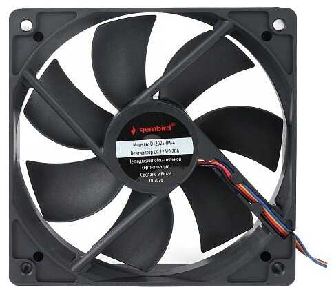- + Все как заявлено: двенадцатисантиметровые габариты, четырёхпиновая колодка для подключения, вертится на двух тысячах оборотов на максимуме, идет с четырьмя саморезами для прикрепления к корпусу.
