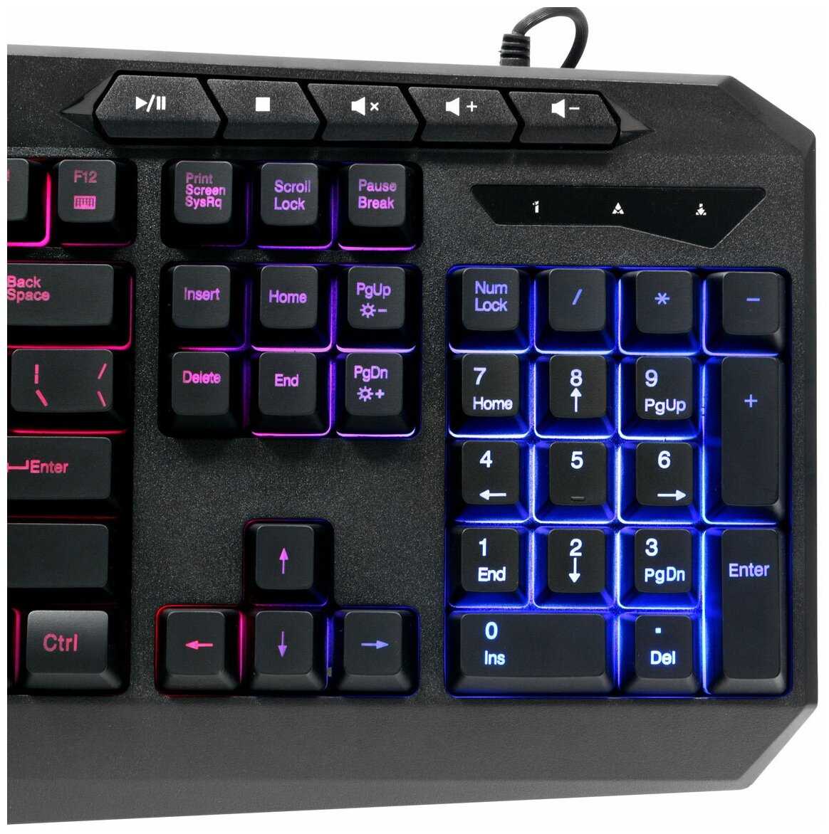 За 1000 руб отличная игровая клавиатура. Ход кнопок большой, нажимаются легко, отклик хороший. Подсветка клавиатуры и кнопок, цвет как на картинке - радуга, можно отключить, можно сделать пульсацию. Не слишком яркая, но и не тусклая. Выглядит красиво. Клавиши хорошо прорисованы. Дополнительные кнопки для регулировки громкости переключения музыки, вызов калькулятора и папки "Мой компьютер"