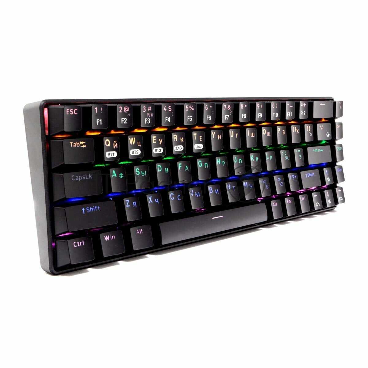 | Дополнительная информация : | Компактная беспроводная механическая клавиатура с подсветкой Rainbow, Металлический корпус, Встроенный аккумулятор, Клавиши с защитой от фантомных нажатий, Механические переключатели Outemu Blue, Три способа подключения: беспроводной (Радио или Bluetooth∗), проводной. |