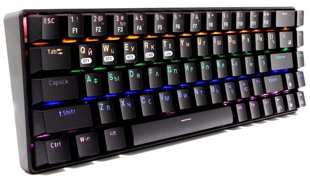 | Дополнительная информация : | Компактная беспроводная механическая клавиатура с подсветкой Rainbow, Металлический корпус, Встроенный аккумулятор, Клавиши с защитой от фантомных нажатий, Механические переключатели Outemu Blue, Три способа подключения: беспроводной (Радио или Bluetooth∗), проводной. |