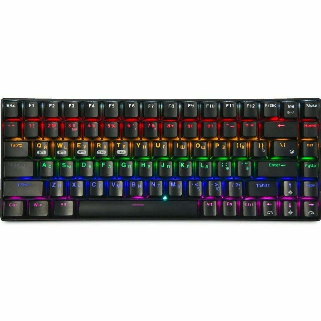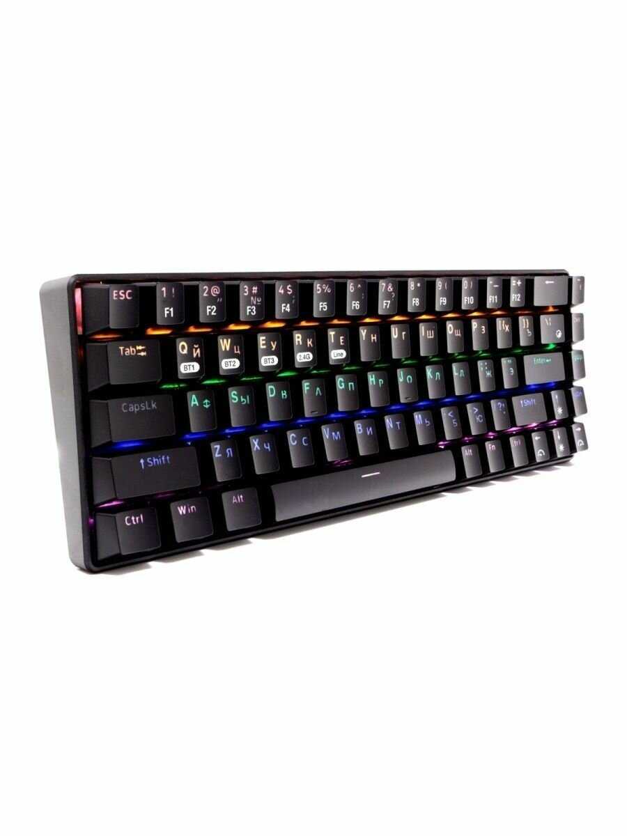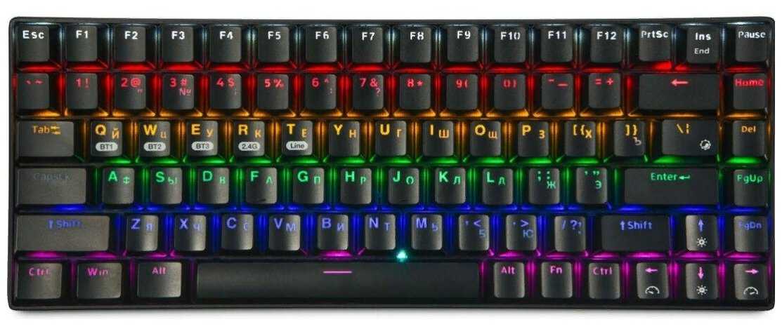 - + компактный размер, мягкий и более менее тихий ход клавиш, подсветка РГБ с множеством режимов рассеивания цветов радуги по клавиатуре, возможность подключения тремя способами к ПК, два из которых беспроводные, имеет приличный вес, что для меня является + к устойчивости на любой поверхности + 4 резиновые накладки с тыльной стороны, хорошо просматриваются оба алфавита, клавиши не сливаются, приемлемая цена (есть интернет магазины где продают ее за 5600 рублей).