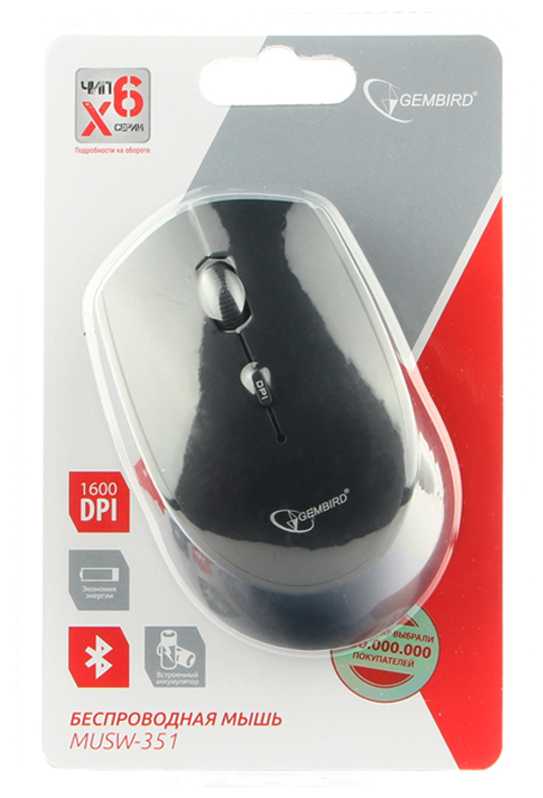 | Комплектация : | Мышь беспроводная Gembird MUSW-351 Bluetooth v.3.0 черный |