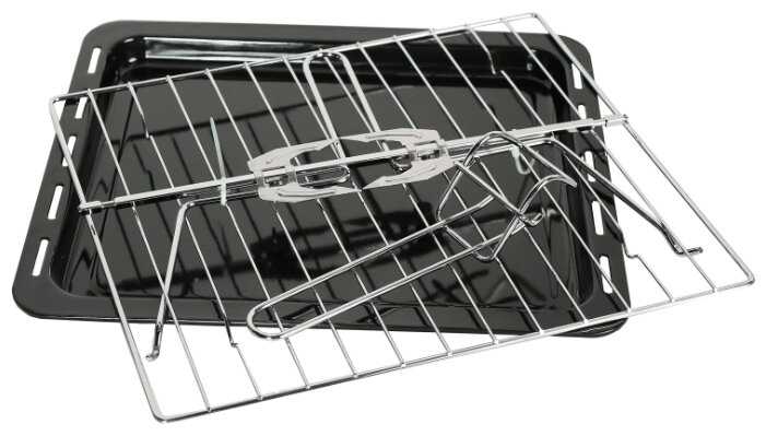 - В комплекте — противень, решетка, вертел и поддон для крошек.