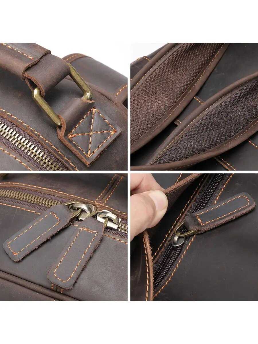 - + натуральная кожа. хорошо прострочены швы, на лямках дышащие подкладки. молнии работают мягко, не закусывают. ноутбук 15" входит в специальный карман со страховочным ремнём.