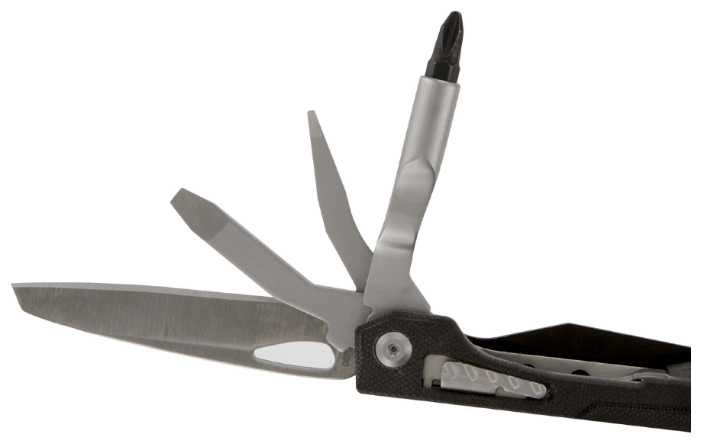 Инструменты (функции) : | плоскогубцы с функцией кусачек и возможностью снятия оплетки с проводов острый клинок с прямой заточкой клинок с серрейторной заточкой; крестовидная отвертка с возможностью замены биты 2 плоские отвертки универсальный небольшой клинок ключ для открывания |