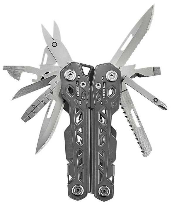 | Инструменты (функции) : | консервный нож, кусачки, линейка, напильник, нож, ножницы, отвертка, открывалка для бутылок, пассатижи, пила, плоскогубцы, шило / кернер |