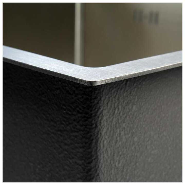 - Сталь толщиной 1–1.2 мм с прорезиненным покрытием на внешней стороне гасит звук падающей струи.