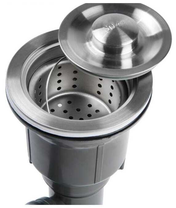 Есть непривычность конструкции слива: имеется глубокая чаша для сбора мусора и остатков пищевых, но сверху не предусмотрена никакая решетка, только плотная крышка, не пропускающая воду.