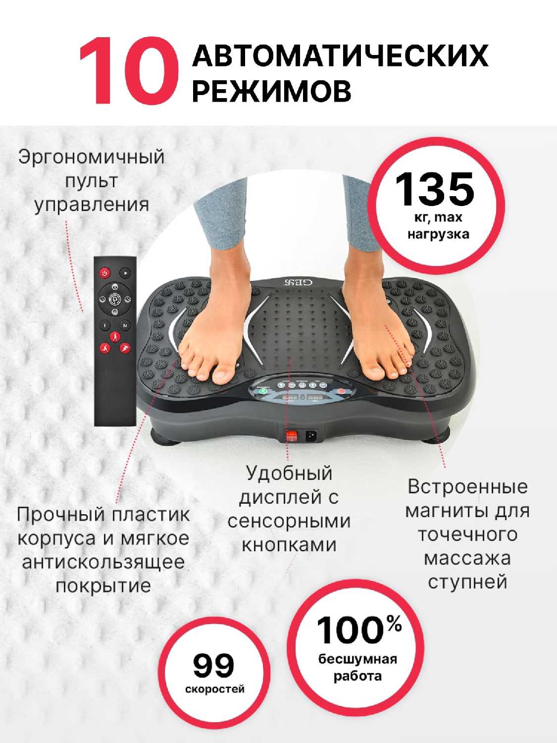 - + Хорошая виброплатформа. Большая мощность, много скоростей и режимов. Есть подробная инструкция с указанием упражнений.