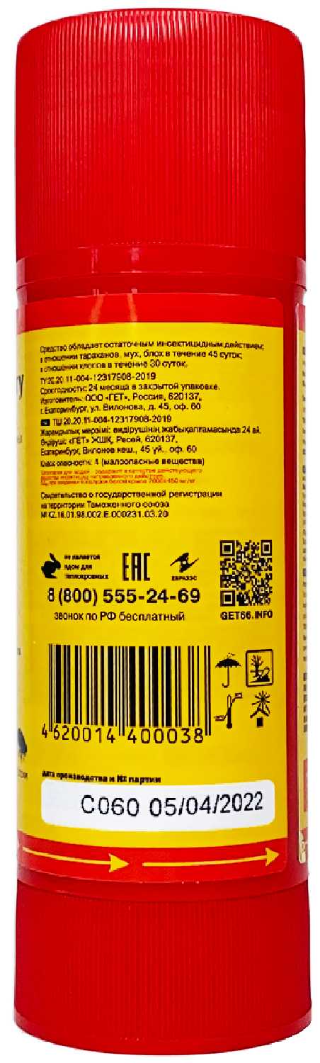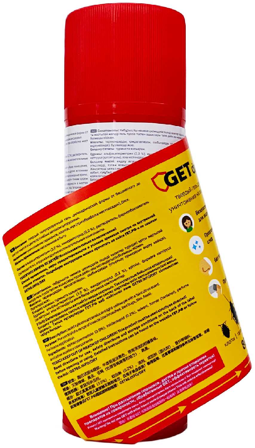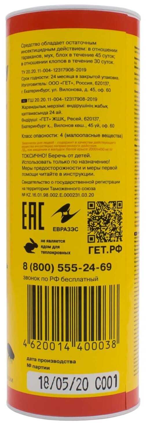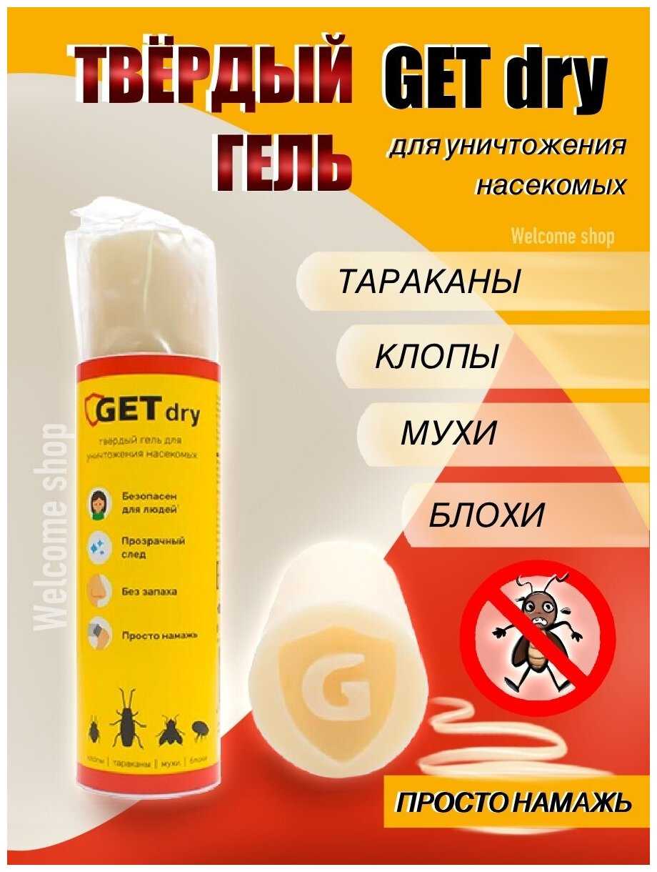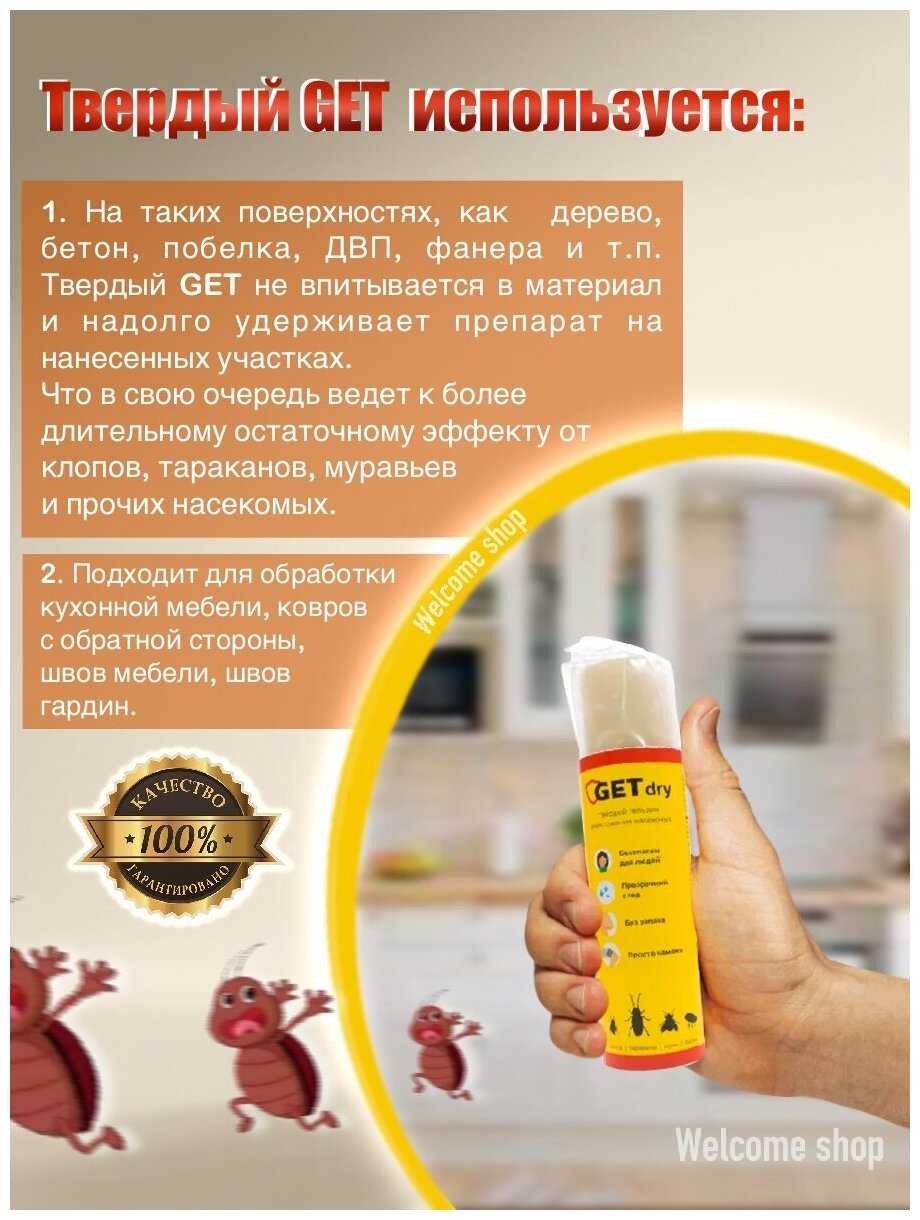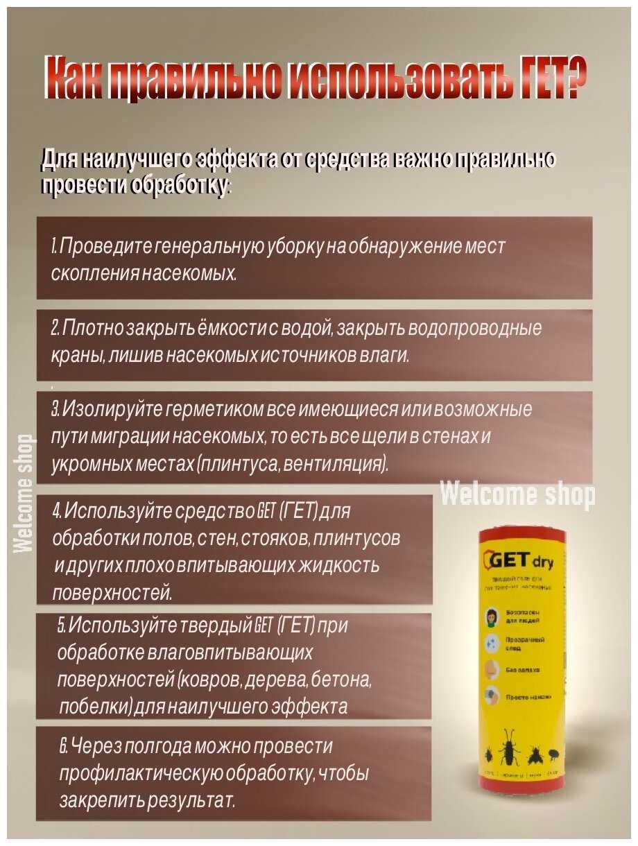 Способ применения : | 1. Проведите генеральную уборку на обнаружение мест скопления насекомых. 2. Плотно закрыть ёмкости с водой, закрыть водопроводные краны, лишив насекомых источников влаги. 3. Изолируйте герметиком все имеющиеся или возможные пути миграции насекомых, то есть все щели в стенах и укромных местах (плинтуса, вентиляция). 4. Используйте GET TOTAL для обработки полов, стен, стояков, плинтусов и других плохо впитывающих жидкость поверхностей. 5. Используйте твердый GET DRY при обработке влаговпитывающих поверхностей (ковров, дерева, бетона, побелки) для наилучшего эффекта. 6. Через полгода можно провести профилактическую обработку, чтобы закрепить результат. |