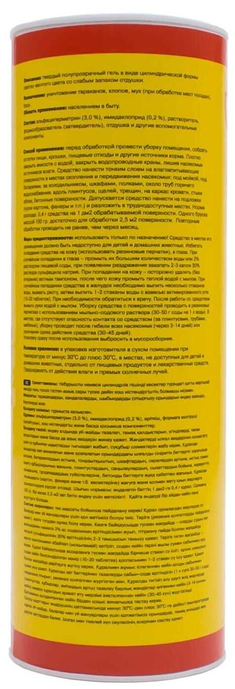 - + Работает отлично. Проверяли на лестничной клетке: провели линию гель-карандашом на стене, когда тараканы добегают до линии, сразу падают!