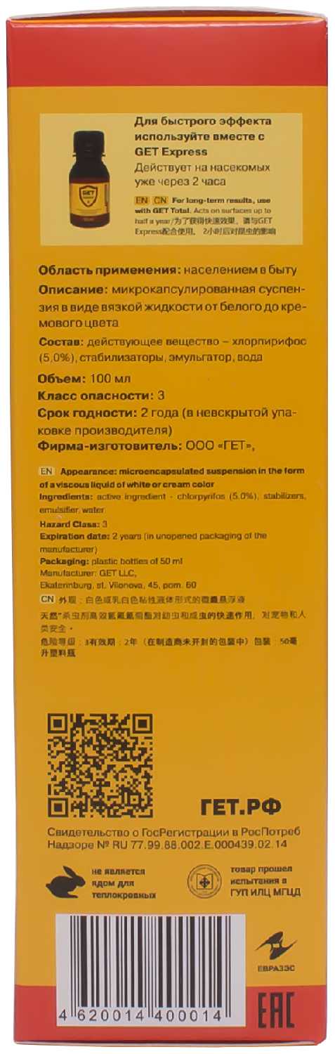 | Подробная комплектация : | 1 флакон GET Total (100 мл), перчатки, респиратор (класс защиты FFP1), подробная инструкция |
