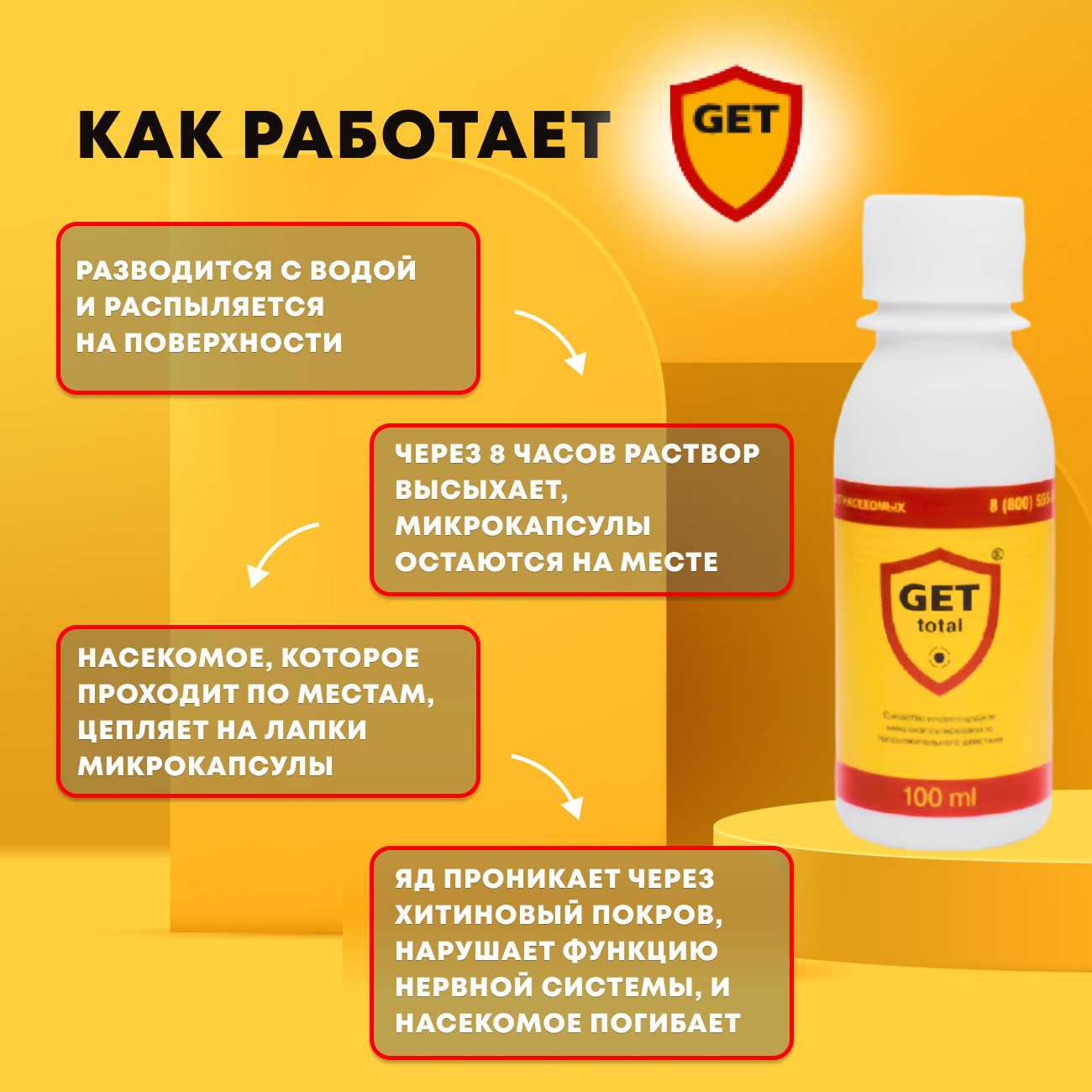 GET эффективно уничтожает популяцию тараканов, о чем свидетельствуют многочисленные отзывы о массовой гибели насекомых после обработки. Препарат действует не мгновенно - в первые дни отмечается повышенная активность "психованных" тараканов, после чего начинается их массовая гибель. Технология микрокапсуляции обеспечивает длительное остаточное действие, поскольку насекомые разносят средство на лапках по всем поверхностям, заражая других особей и воздействуя на яйца и личинки. -