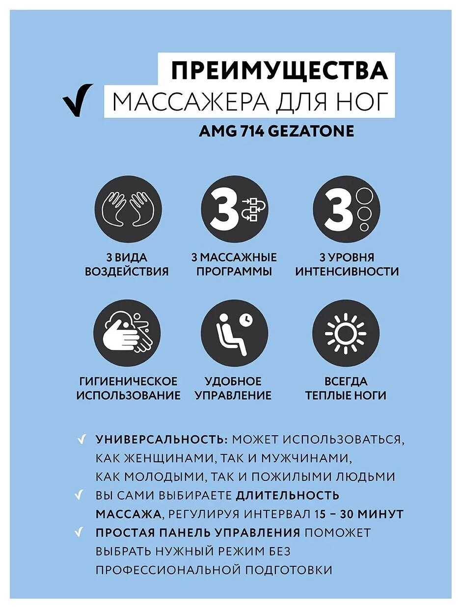 - Функция прогрева стоп (до 40°C) усиливает терапевтический эффект, особенно при отеках или переохлаждении.