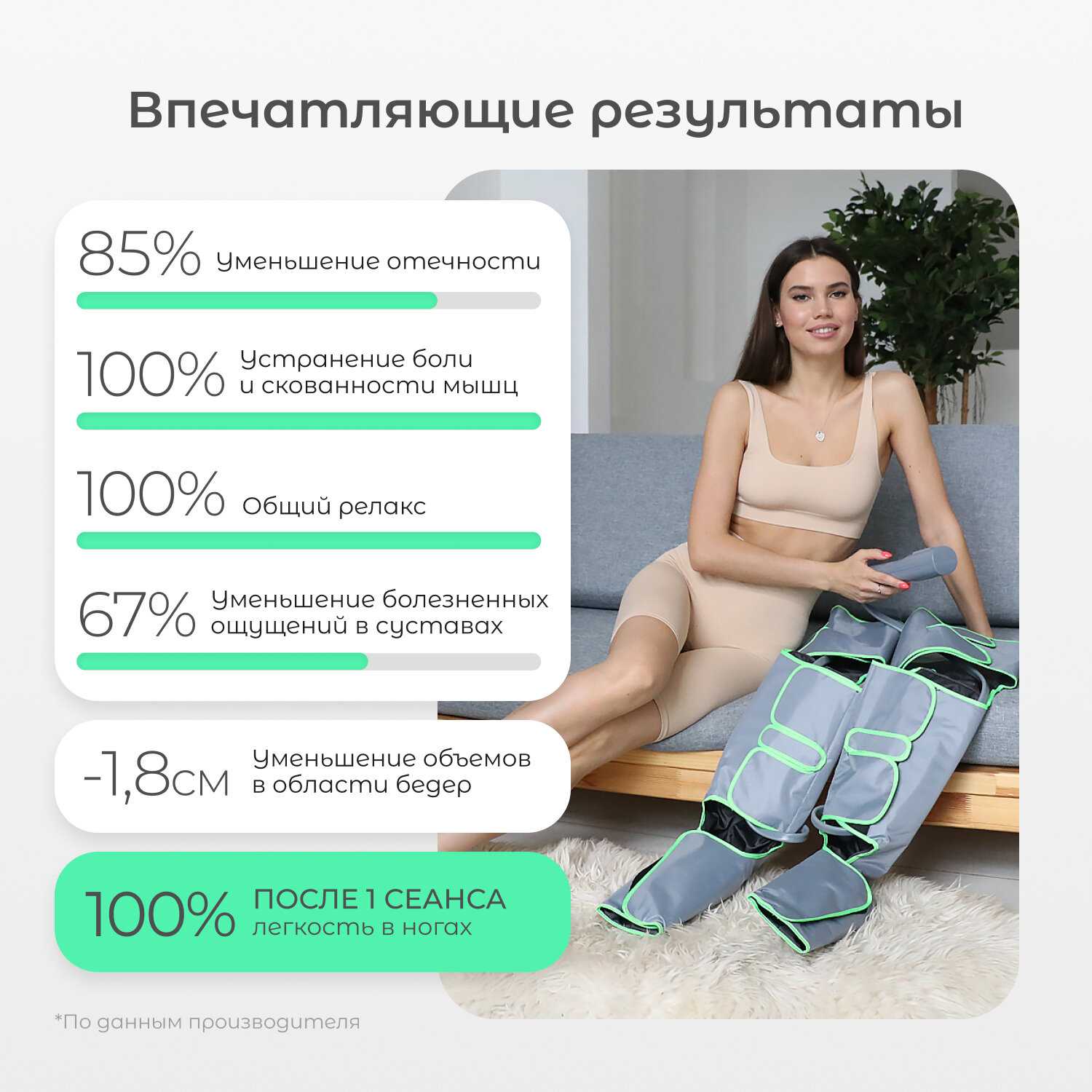 - + Массажер помогает снимать усталость с ног, также способствует спаду отеков в большинстве случаев. Иногда, когда бывают очень сильные отеки, он не помогал, но это уже в большей степени зависит от организма и причин отеков. Однозначно стоил своих денег. Такой аппарата не будет лишним для тех кто страдает отеками и у кого начальная стадия развития варикоза. Нужно о себе заботится и этот массажер поможет в этом.