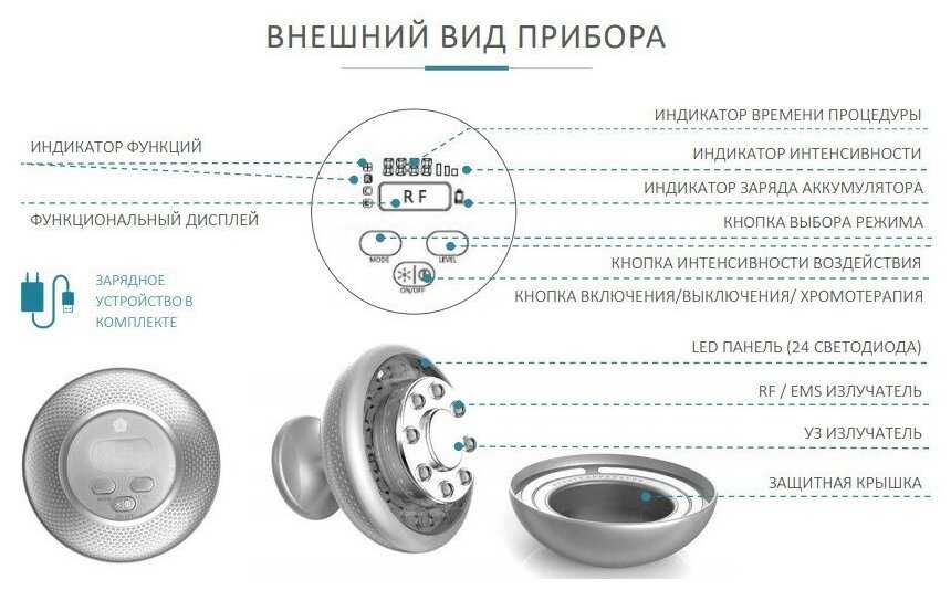 Дополнительная информация : | частота в режиме RF 500 кГц, частота в режиме кавитации 800 кГц, красный свет 622 нм, синий свет 467 нм |