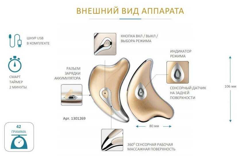 | Дополнительная информация : | 2 режима работы, для максимально эффективного воздействия прибор должен находиться под углом 30 – 45 градусов к поверхности кожи, в области глаз ограничением области воздействия прибора является костная граница орбиты |