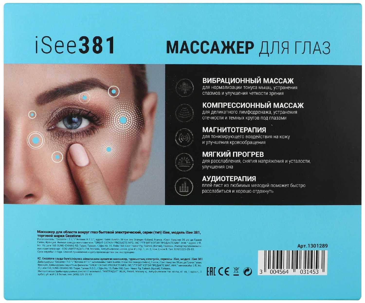 | Дополнительная информация : | 5 режимов работы, размер упаковки 200 х165 х 100 мм, использование массажера iSee 381 от Gezatone при травмах после операций на глаза и неврологических заболеваниях возможно только после консультации со специалистом |