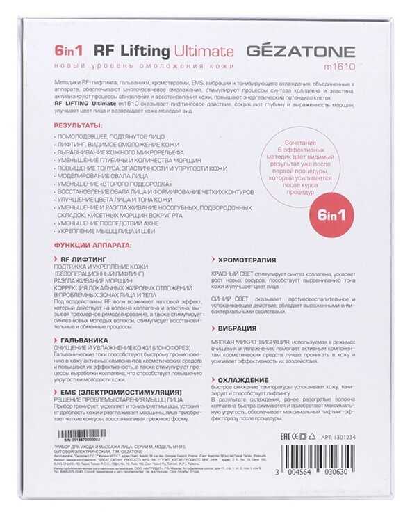 | Принцип работы : | RF-лифтинг, вибрация, гальванотерапия, микротоки, миостимуляция, светотерапия |