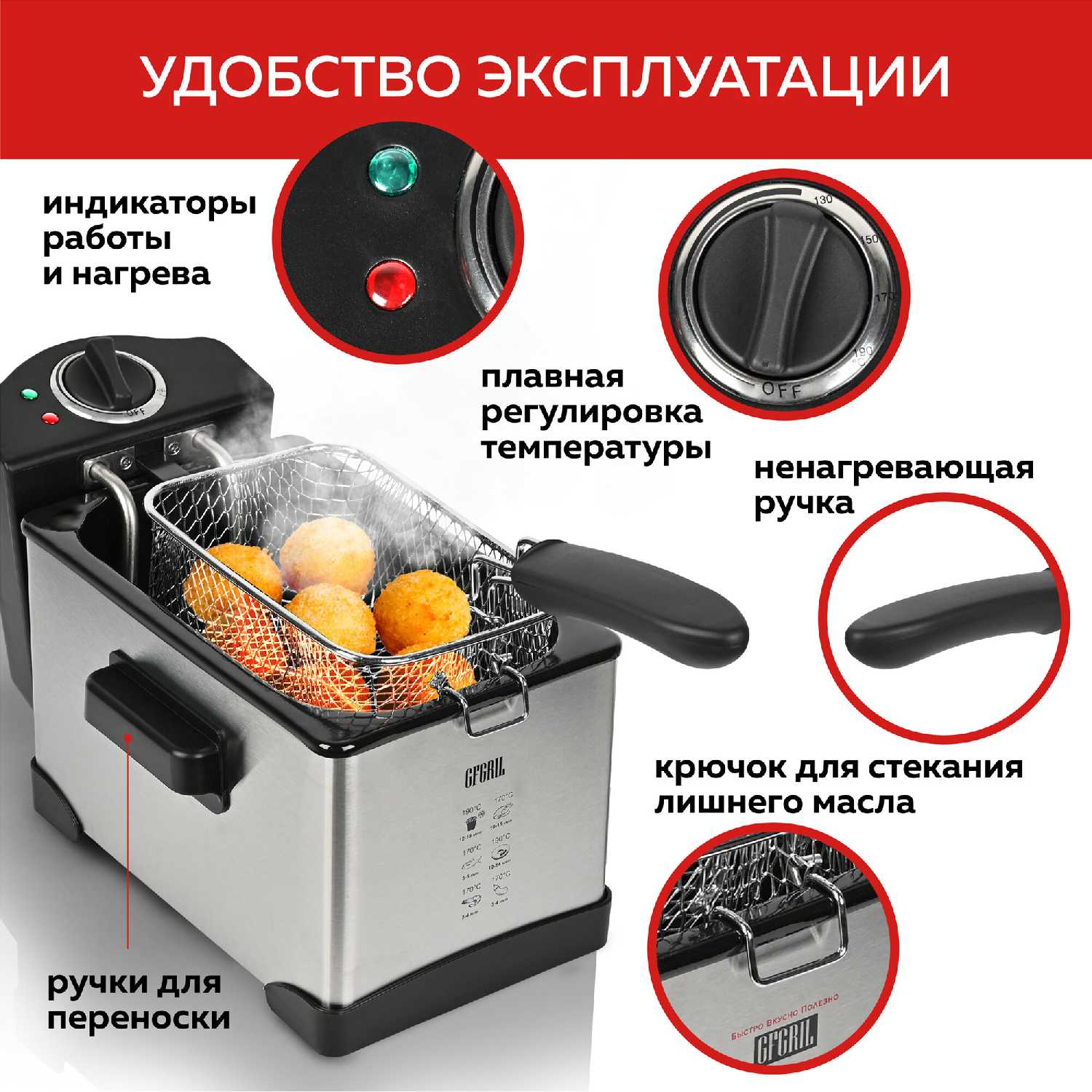 - Автоматическое отключение при перегреве масла (свыше 210°C) предотвращает возгорание.