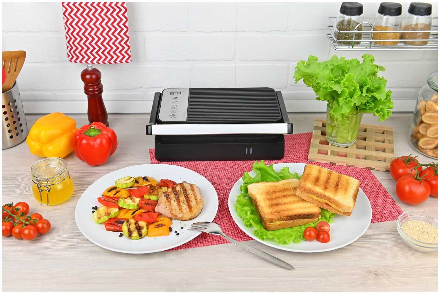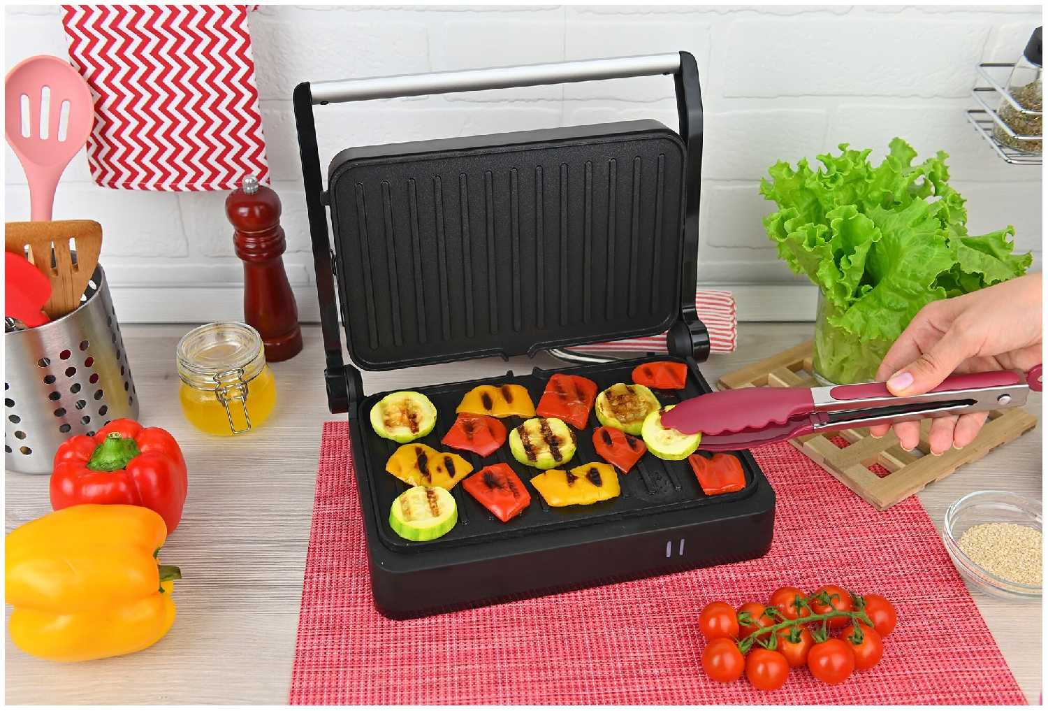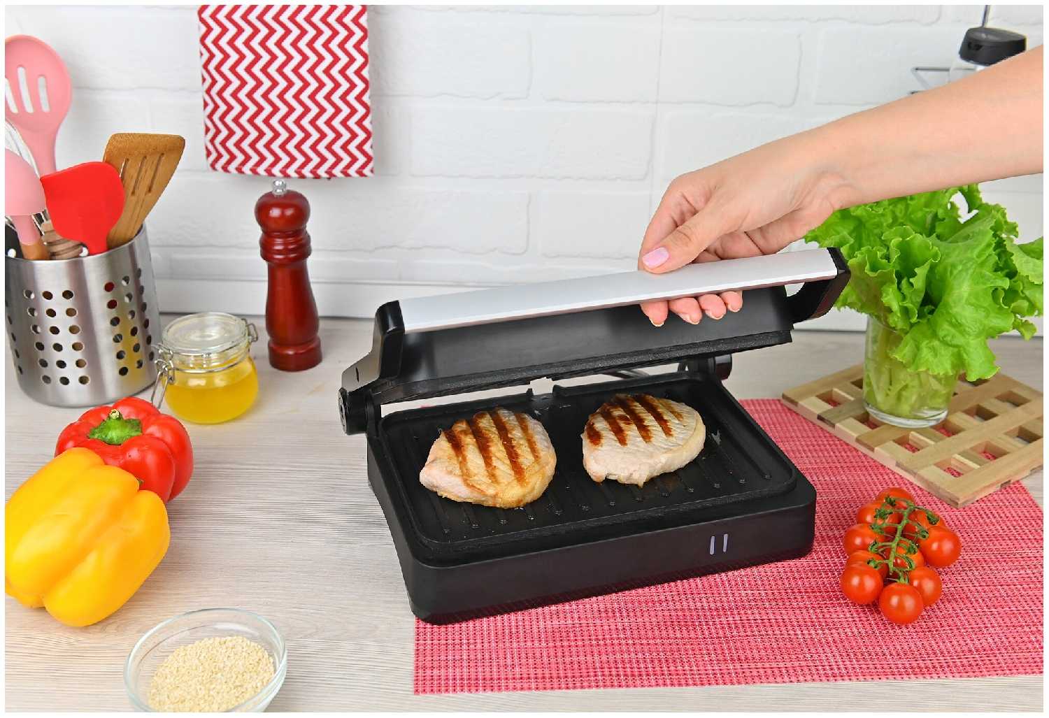 - Регулируемая крышка адаптируется под толщину продуктов (до 2–3 см), что подтверждают отзывы о готовке сэндвичей и стейков.