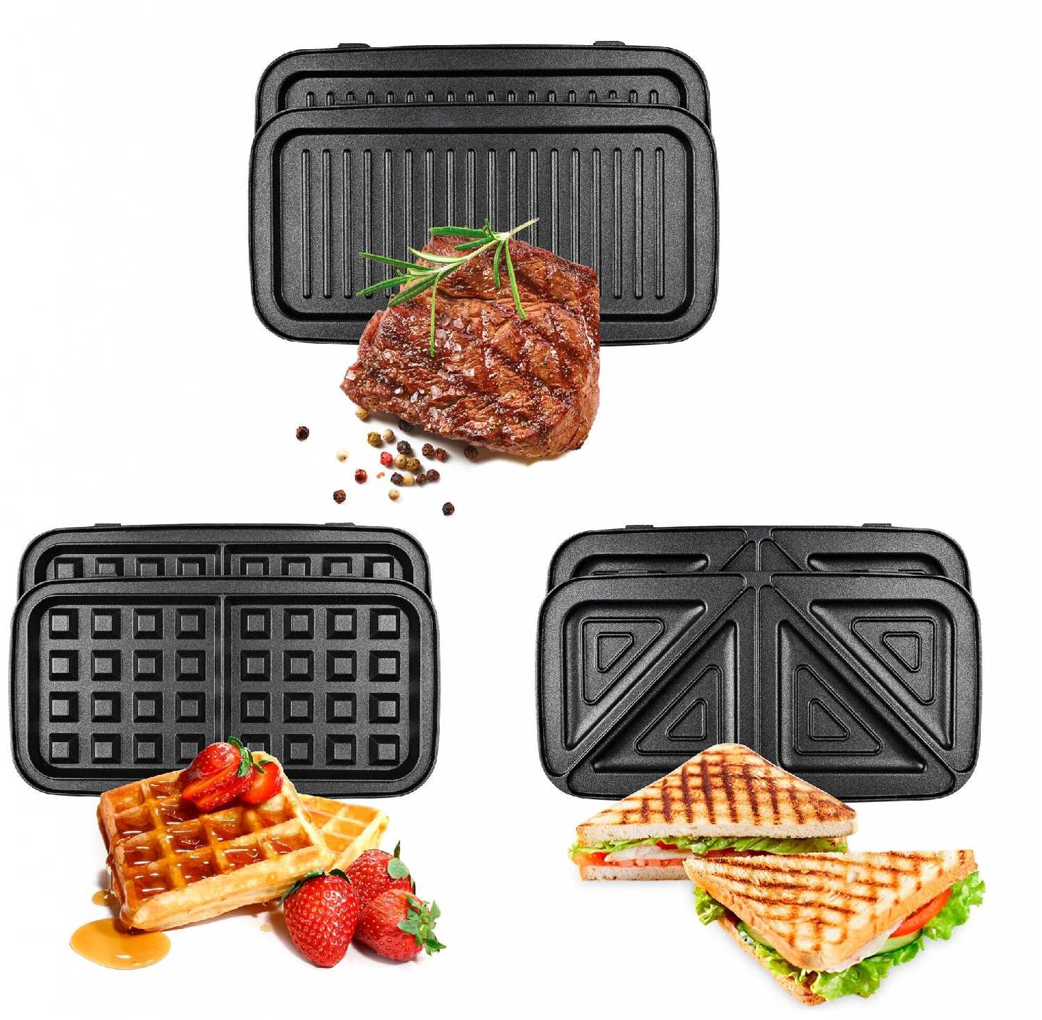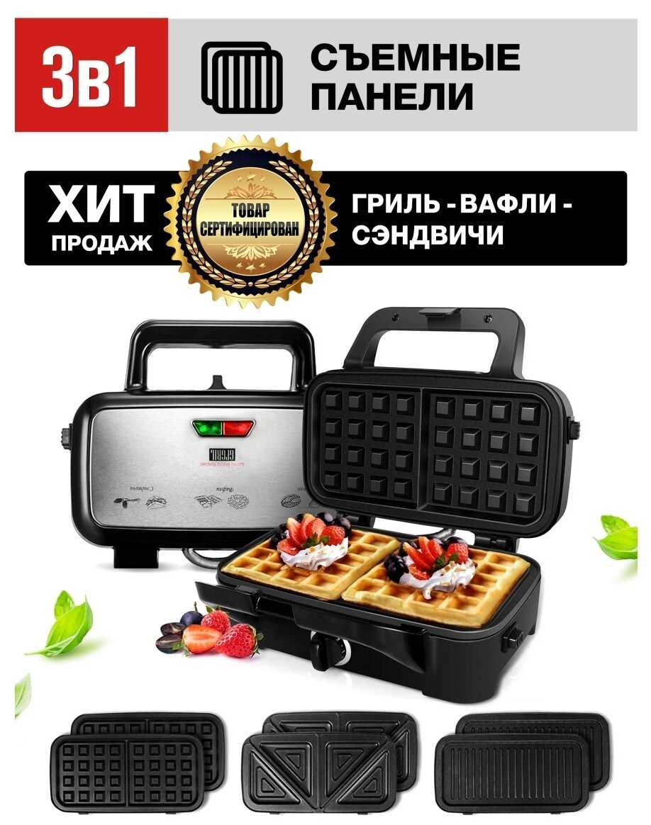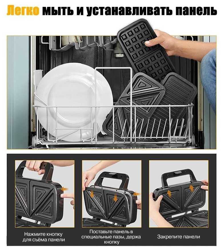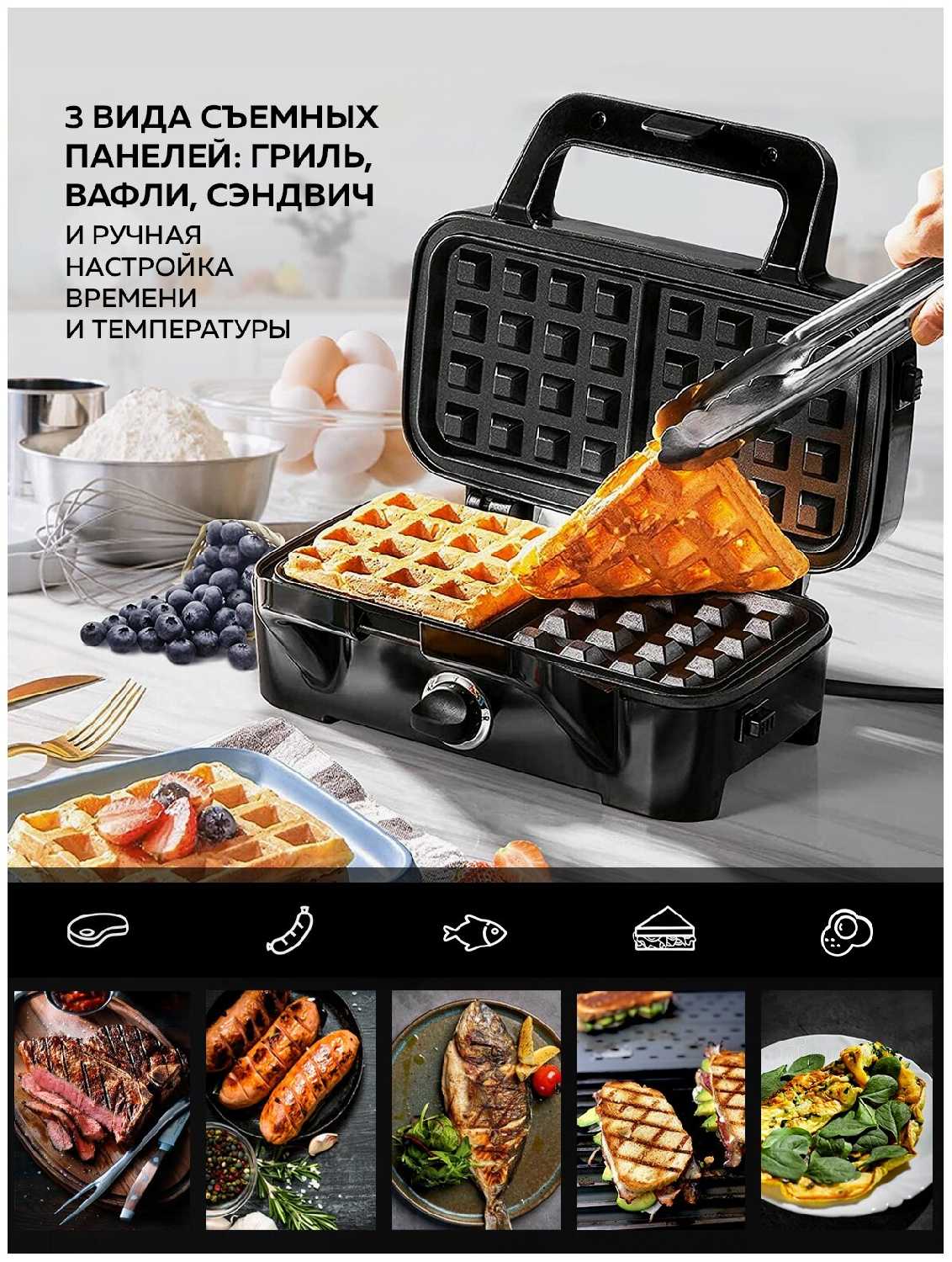 - В комплекте идут 3 типа панелей: гриль, сэндвич и вафельница, что расширяет меню от стейков до десертов.